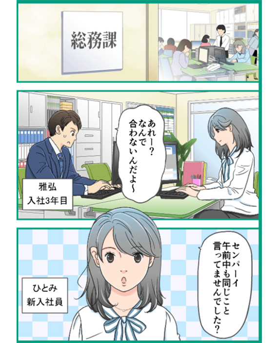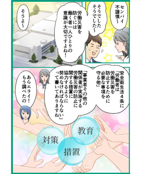 総務課の新入社員が先輩から、労働災害と、それを未然に防ぐための法律(労働安全衛生法)について学びます。労働災害の防止には、社員一人ひとりの自覚と覚悟が必要です。
